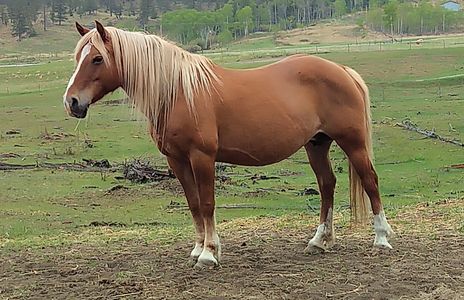 .'Maggie' is a beautiful, true golden-coloured chestnut mare and the smallest of our herd standing at 13.1hh tall. She is an original Canadian BC-bred mare, but with a rich German-Austrian heritage.
