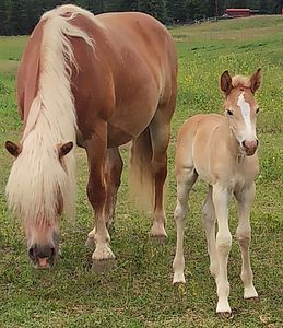 The picture to the left shows Dyhlia's 2020 filly 'Daphne BTA' now standing in Alberta. Daphne was sired by Bandito and turned out to be a very impressive, well muscled and picture-book Haflinger!